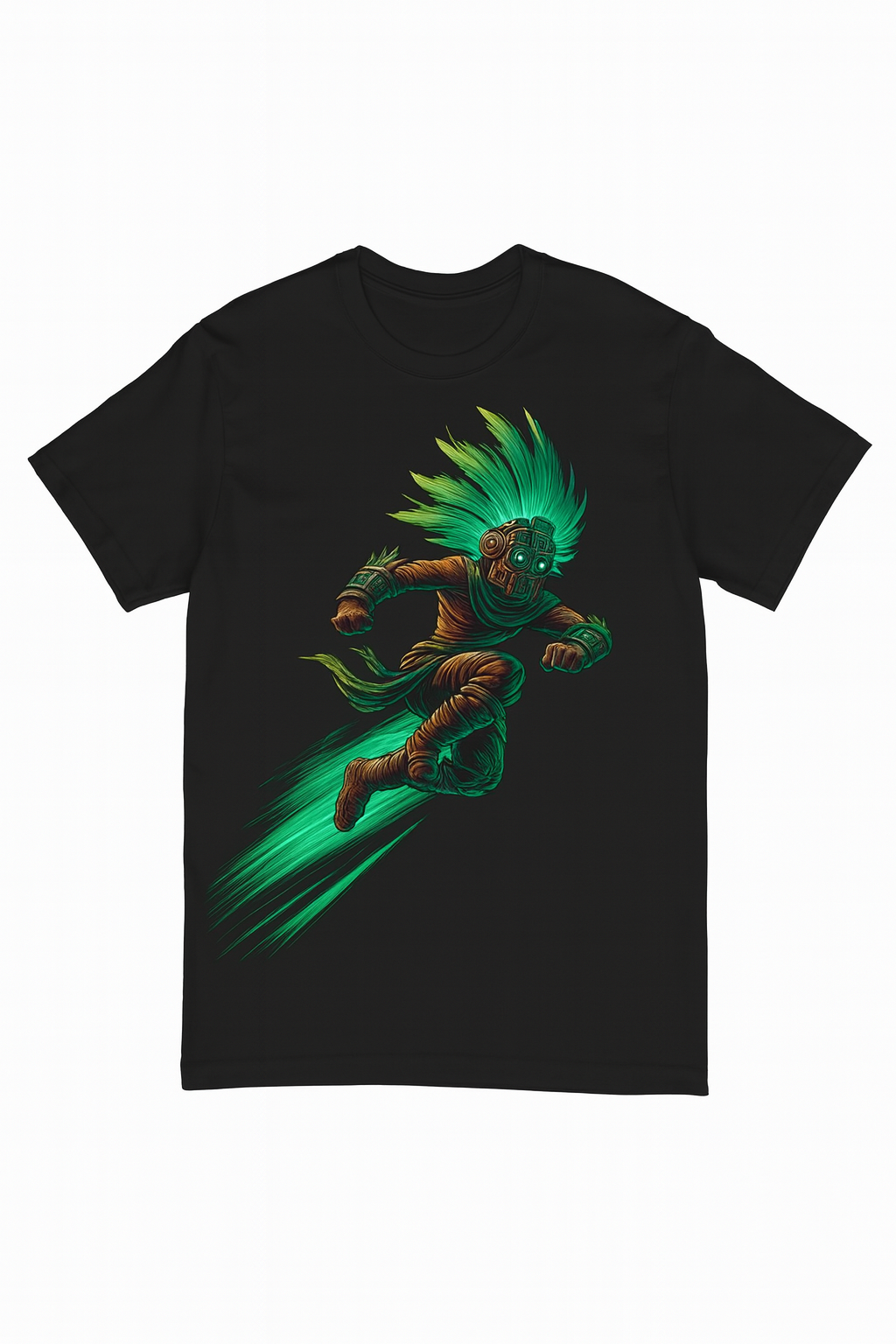 Lleva la fuerza y el espíritu ancestral contigo con esta playera inspirada en el Guerrero del Mictlán. Su diseño fusiona elementos prehispánicos con un estilo moderno y vibrante, mostrando una ilustración detallada que destaca plumas verdes brillantes, patrones ceremoniales y símbolos mexicas que evocan poder, tradición y misticismo.